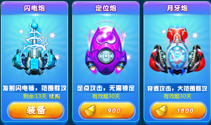 3、每种炮塔技能各不相同,回旋炮、闪电炮、月牙炮一炮弹可捕获多条鱼;
