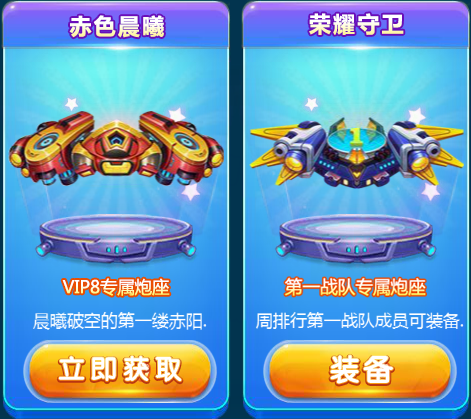 玩家获取炮座后可根据自身喜好更换游戏内的炮座,给予玩家VIP身份象征。