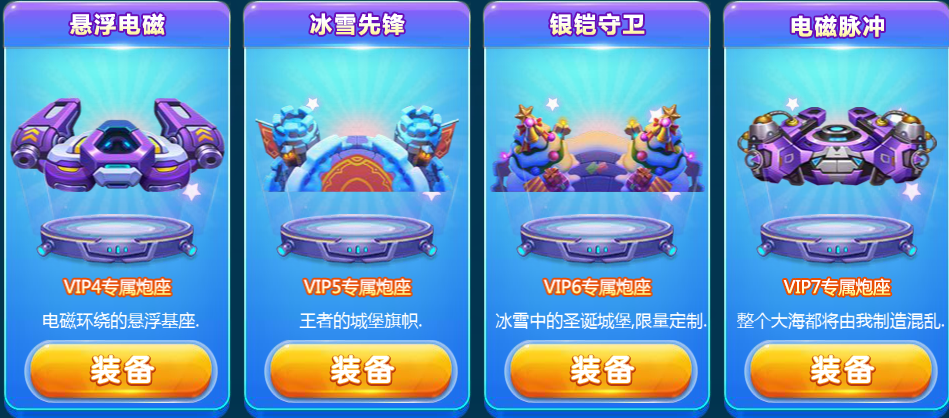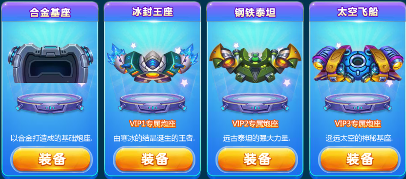 玩家获取炮座后可根据自身喜好更换游戏内的炮座,给予玩家VIP身份象征。