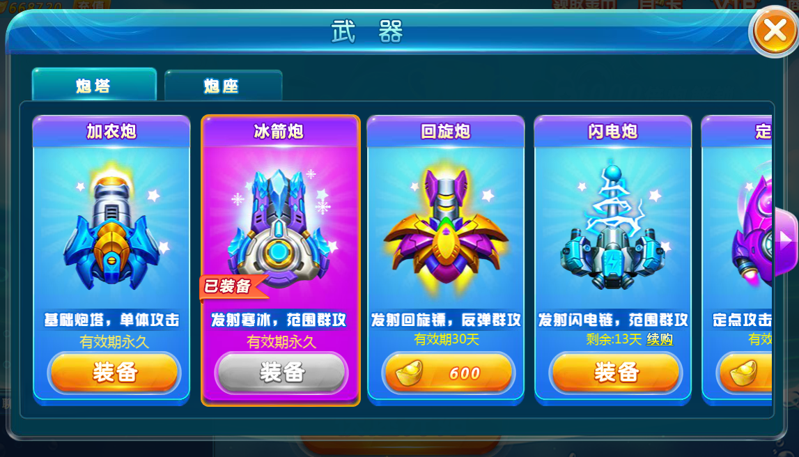 玩家进入游戏可获得基础炮塔“加农炮”,玩家可通过首充获得永久炮塔“冰箭炮”,通过元宝购买30天限时武器,炮塔续购时间可叠加;